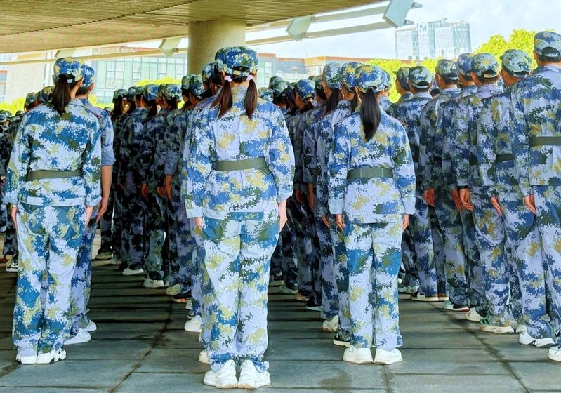 站军姿,是军训的开篇。双脚分开六十度,双手紧贴裤缝,抬头挺胸,目视前方。