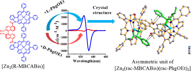 Abstract: Chiral discrimination of amino acid stereoisomers is essential for biological processes and pharmaceutical development. Bisporphyrins represent promising candidates for the chiral recognition of amino acid derivatives. Herein, we report a rationally designed binaphthyl-linked zinc bisporphyrinate complex demonstrating remarkable enantioselective binding toward l-phenylglycine ethyl ester (L-PhgOEt). The complex demonstrates a 19-fold amplification in circular dichroism (CD) response intensity for L-PhgOEt over its d-enantiomer, with quantified enantioselectivity (L/D = 4.8), reflecting good chiral recognition capabilities. Single-crystal X-ray analysis unveils a multimodal recognition mechanism involving (i) axial coordination to zinc centers, (ii) hydrogen bonding interactions with amide functionalities, and (iii) π-system stabilization through both C–H···π and O···π interactions with the methoxy-functionalized binaphthyl linker. This synergistic combination of coordination bonds and noncovalent interactions establishes bisporphyrins as tailorable chiral receptors and guides the design of biomimetic systems for pharmaceutical applications.