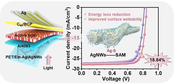 Abstract:Silver nanowire (AgNW) electrodes, known for their intrinsic flexibility and tunable optoelectronic properties, have garnered considerable attention for use in flexible organic solar cells (OSCs). However, in conventional OSCs, their low work function (WF) causes energy-level mismatches with classic aqueous hole transport layers (HTLs), while their poor hydrophilicity hinders the formation of optimized HTL morphology and crystallinity, posing challenges to their integration into high-performance OSCs. To address these issues, functionally targeted molecules with a thiol group at one end and strong electron-withdrawing, hydrophilic functional groups at the other are precisely engineered to wrap around the AgNW electrodes. The thiol group facilitates the formation of robust self-assembled molecules (SAMs) on the AgNW electrodes through stable S−Ag chemical bonds at room temperature. The strong electron-withdrawing groups generate notable molecular and interfacial dipoles that effectively raise the WF of AgNW electrodes. Notably, the hydrophilic groups not only improve electrode wettability but also promote strong hydrogen bonding interactions with HTL, leading to substantial improvements in the morphology and crystallinity of the HTL. This precision wrapping strategy enables the fabrication of high-efficient conventional flexible OSCs, achieving a record power conversion efficiency of 18.84 % (certified at 18.56 %) for flexible OSCs based on ITO-free transparent electrodes.