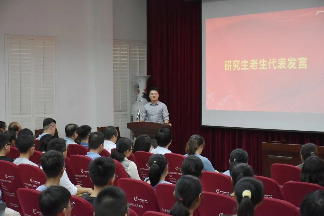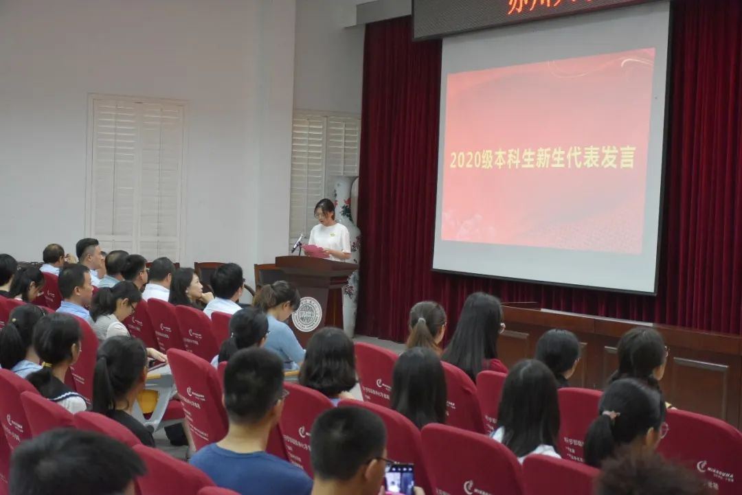 随后,2020级研究生新生代表何加钦上台发言。他结合自己的亲身经历,向同学们提出三大建议,使同学们备受激励。展望四年的大学青春之旅,2020级本科生新生代表陈辉辉同学希望同学们依靠勤奋和努力实现更广阔的人生,同时也希望大家在课余积极参加社团活动以培养团队意识。典礼最后,李翔做了总结发言,要求新生们,从个性品质到道德修养,从自我意识到国家情怀,全方位的完善、提升自己。