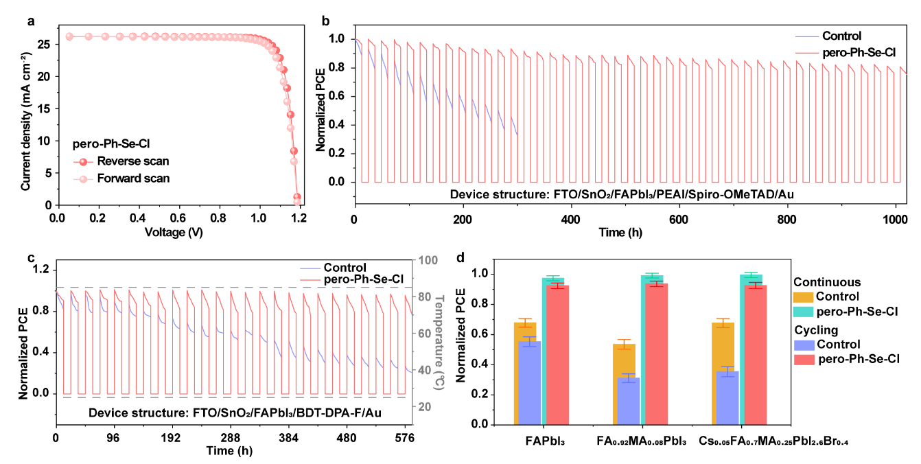 基于上述研究,李耀文教授团队设计合成了一系列配体材料来消除晶格应力变化、稳定钙钛矿晶格。其中,苯基氯化硒(Ph-Se-Cl)展现了独特的作用:Ph-Se-Cl在热退火过程中和有机阳离子盐反应形成易挥发物质,优化了钙钛矿的晶体生长动力学,获得了对称性更高、室温稳定的钙钛矿晶格;此外,Ph-Se-Cl和碘化铅反应生成含硒铅酸盐并锚定在晶界处,进一步抑制了光、热诱导的晶格膨胀收缩,消除了晶格应力变化。最终,基于Ph-Se-Cl制备的钙钛矿太阳能电池认证效率高达26.32%。同时,在昼夜循环模式下,器件的T80寿命(器件效率衰减至初始效率的80%所需的时间)显著提高了10倍;基于其它ISOS协议测试的器件稳定性均得到大幅提升(图2)。该工作成功揭示了在昼夜循环工作模式下钙钛矿太阳能电池独特的降解机制,并强调了稳定晶格以增强电池实际工作寿命的必要性。此外,该工作还指出了,针对具有软晶格特性的钙钛矿太阳能电池建立实际应用中的寿命评估方法的重要性,将加速其商业化进程。