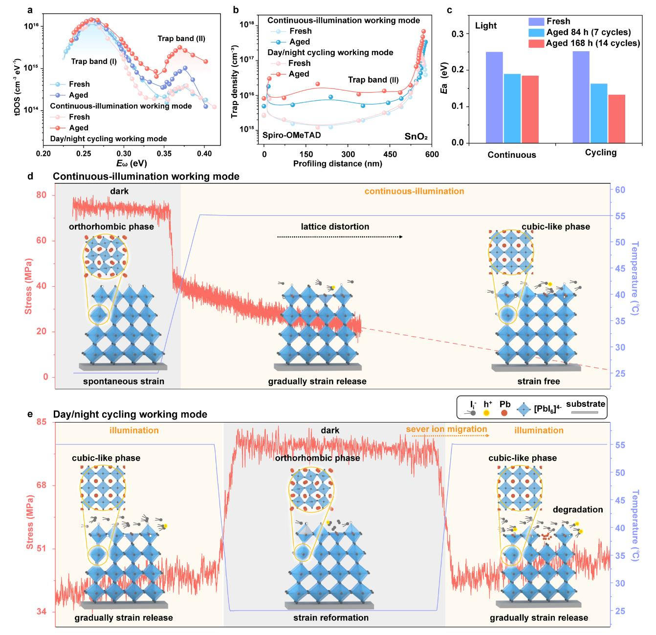 针对上述问题,李耀文教授团队首先研究了钙钛矿太阳能电池在连续光照和昼夜循环工作模式下的降解行为,发现电池在昼夜循环模式下性能衰减更为迅速。通过对软晶格钙钛矿的原位演变分析和载流子动力学研究,发现循环模式下的温度波动会诱导钙钛矿晶格膨胀收缩,从而产生周期性的晶格应力变化;在连续光照模式下,晶格则呈现应力逐渐释放的状态。相比较而言,应力的周期性变化会产生更多深能级缺陷,这些缺陷在暗态下不能进行“自修复”;此外,积累的深能级缺陷加速了钙钛矿的离子迁移,是昼夜循环模式下电池性能快速衰减的主要原因(图1)。