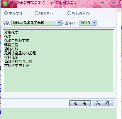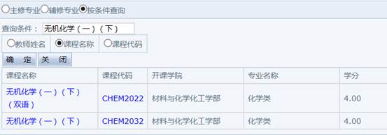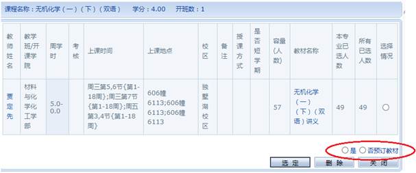 填入正确的课程名称(或关键词)点击“确定”,相应的课程就会出现在下方,点击课程名称会弹出窗口,显示可供选择的教学班信息(注意右下角教材预定操作)。