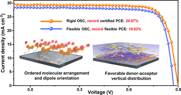 Abstract: Self-assembled monolayers (SAMs) based on carbazole with minimal parasitic absorption, such as the most widely used [2-(9H-carbazol-9-yl)ethyl]phosphonic acid (2PACz), dominate the high-performance hole transport layer (HTL) for conventional organic solar cells (OSCs). However, the small dipole moment of the 2PACz molecules results in weak molecular dipole–dipole interactions, leading to disordered dipole orientation and restricting work function modulation, which causes serious interfacial energy loss. Here, we grafted thiophene groups at both ends of the carbazole in 2PACz to obtain an SAM material (Th-Cz), which formed a transient resonance structure during thermal annealing, resulting in a twice-enlarged dipole moment. This strengthened molecular dipole–dipole interactions, facilitating ordered arrangement and dipole orientation of the Th-Cz film, contributing to a higher work function, which enhanced hole extraction and suppressed energy losses at the SAM/active layer interface. Additionally, van der Waals interactions between Th-Cz and the donors enabled the donor crystallizing before the acceptor, and this phenomenon is different from the cocrystallization observed in 2PACz-based active layers. This manipulation of crystallization dynamics favors vertical phase separation with a donor-rich phase at the bottom of active layers, leading to balanced charge-carrier mobilities. The resultant OSCs based on PM6:Y6 and D18-Cl:N3:AT-β2O with Th-Cz as HTL achieved power conversion efficiencies (PCEs) of 19.34% and 20.91% (certified 20.67%), respectively, setting a record PCE for the PM6:Y6-based OSCs and achieving the highest certified PCE for single-junction OSCs to date. Notably, Th-Cz also demonstrated exceptional compatibility with flexible OSCs, delivering a record PCE of 19.63%.