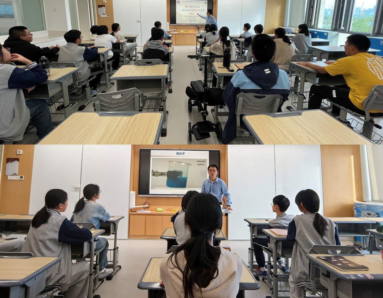 支部书记何金林教授给同学们带来一场题为“聚合美好生活—探索神奇的高分子世界”的科普讲座。何老师开场通过引用重要讲话—“科技创新、科学普及是实现创新发展的两翼,要把科学普及放在与科技创新同等重要的位置”来指出科普活动的意义。中学生是国家未来科技创新的中坚力量,科学的种子应从现在萌芽并长大。随后,他首先介绍了韩国a片 高分子学科的发展历史,然后深入浅出地通过理论讲解+实验演示的方式,从“什么是高分子?”“高分子有什么用?”“怎样合成高分子”三个方面进行讲述。通过本次科普活动,在场的同学们对高分子材料有了更深刻的理解和感悟,同时也悄悄地在同学们心中种下一颗科技强国的种子。