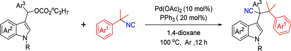 Abstract: A palladium-catalyzed carbo-cyanation reaction for synthesizing bulky nitriles with an all-carbon quaternary center via a “cut-and-sew” process of isocyanides is presented. The reaction proceeds through oxidative addition of indole-derived carbonate to Pd(0), followed by decarboxylation, migratory insertion, and the formation of a ketenimine intermediate. A geminate radical pair is formed, leading to radical coupling and the final bulky nitrile product. The method demonstrates high efficiency and a wide substrate tolerance, offering a valuable strategy for constructing bulky nitriles in organic synthesis with potential applications in drug development.