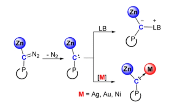 Abstract: Metal-substituted carbenes are fundamentally important as they represent the limiting configurations of metal carbynes. However, structurally characterized examples are still rare, and their reactivity remains underexplored. Herein, we report the first synthesis, characterization, and reactivity studies of zinc-substituted carbenes. UV irradiation of zinc diazoalkyl complexesLZnC(N2)P [L = [(ArNCMe)2CH]−,P= (DippNCH2)2P, Ar = Dipp or Mes, Dipp = 2,6-iPr2C6H3, Mes = 2,4,6-Me3C6H2] generates Zn(II)-substituted carbenesLZnCP with concomitant N2 release. The Zn–C–P moiety features nearly linear carbene centers, deviating from conventional carbene geometry. Computational studies indicate a singlet ground state stabilized through synergistic effects of C–P π-interaction and carbene lone-pair delocalization towards the Zn center. Treatment ofLZnCP with CO2 selectively affords zincated ketene via nucleophilic attack and tandem C[double bond, length as m-dash]O double bond cleavage. It reacts with 4-dimethylaminopyridine to form a carbene-Lewis base adduct exhibiting electrophilic reactivity. Furthermore, zinc-substituted carbenes enable direct transition metals coordination to give the heterobimetallic Zn/M (M = Ag+, Au+, Ni) μ-carbyne complexes.