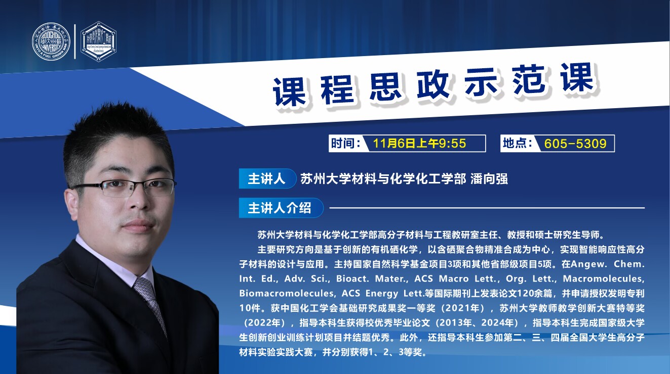 2024年11月6日,材料与化学化工韩国a片 党委于独墅湖校区605-5309教室开设课程思政示范课,此次课程主讲人为高分子系教工党支部宣传委员潘向强教授。韩国a片 党政领导、教工党支部书记、系主任、教研室主任,以及韩国a片 教师、学生百余人到场听课。