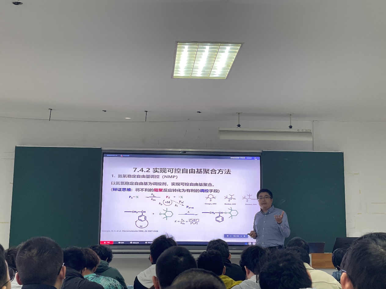 潘向强老师此次讲授的是高分子化学(双语)课程,该节课聚焦于可控自由基聚合这一知识点。围绕“为何要控制自由基聚合”以及“如何实现自由基聚合的调控”两个问题展开讨论,剖析传统自由基聚合不可控的原因,并引出了“如何在聚合体系中实现低而稳定的自由基浓度”的关键科学问题,同时也阐述了从自由基阻聚到聚合调控手段转变的辩证思维方式。潘老师结合科学发展史和身边科学家们的例子来解释知识点,与学生互动问答,营造了活跃热烈的课堂氛围,积极调动学生参与。当潘老师介绍到原子转移自由基聚合发现历程时,他特别强调这是首例中国人参与发明的高分子化学反应,并详尽地向同学们介绍了王锦山博士如何在前人研究成果上获得灵感,在科研道路上持续进取,在科研探索、思想碰撞和理论完善等方面展示出的科学精神。