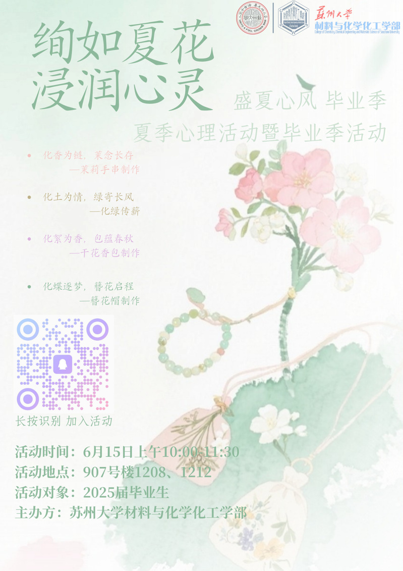特别策划“绚如夏花 浸润心灵”—盛夏心风·毕业季活动,将四场沉浸式毕业手作体验与夏季心理疗愈理念融合,让指尖的温度与心灵的舒展,把苏大记忆“实体化”,让我们一起,为在苏大的青春美好镌刻专属印记。