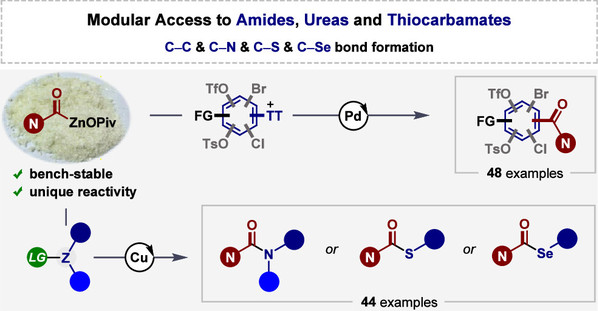 Abstract: Amide units and relative carbonyl families such as ureas and their derivatives are central important backbones of numerous compounds with activities of relevance to biology or medicinal chemistry. Driven by their prevalence, a general technology that enables sustainable amide-unit synthesis should afford new opportunities for chemical innovation. Generally, stoichiometric quantities of activating reagents, (tri)phosgene and its derivatives, or CO are commonly used in the literature to construct such scaffolds, which represent the drawbacks of these approaches. As such, we herein report a new series of salt-stabilized carbamoylzinc pivalates prepared from the corresponding formamides through C–H metalation in the presence of TMPLi (TMP = 2,2,6,6-tetramethylpiperidyl) and Zn(OPiv)2. These carbamoylzinc pivalates are obtained as powders with high air and moisture stability under ambient conditions. They also show excellent reactivity in palladium-catalyzed C–S-selective Negishi carbamoylation and copper-catalyzed electrophilic amination, thiolation, and selenolation, thus unlocking a new platform to access functionalized amides, unsymmetric ureas, thiocarbamates, and selenocarbamates through C–H zincation and C–C or C–heteroatom coupling reactions in a sustainable manner. Finally, late-stage modification of drug-like molecules and direct synthesis of drugs showcase the potential of this protocol in medicinal chemistry.