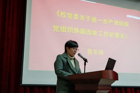 全体奏唱国歌完毕后,校党办副主任袁冬梅宣读《校党委关于进一步严肃院级党组织换届选举工作的要求》。