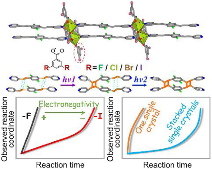 Abstract: Understanding the kinetics of solid-state chemical reactions is critical for elucidating reaction mechanisms and enabling the rational design of functional materials. However, such investigations are often impeded by limited molecular mobility, restricted reactant interactions, and complex nucleation phenomena. In this study, we employ one-dimensional crystalline coordination polymers (CPs) as structurally ordered platforms to investigate the kinetics of [2+2] photocycloaddition reactions of embedded alkene substrates. By integrating nuclear magnetic resonance, fluorescence spectroscopy, laser scanning confocal microscopy, and theoretical calculations, we demonstrate that the electronegativity of substituents (−F, –Cl, –Br, –I) on carboxylate ligands strongly modulates reaction rates, with more electronegative groups accelerating the kinetics. Additionally, single-crystal CPs exhibit significantly enhanced reaction rates compared to stacked crystals, attributed to uniform light penetration and reduced spatial inhomogeneity. These findings position CPs as robust model systems for probing heterogeneous reaction kinetics and offer a new framework for understanding and optimizing olefin reactivity in solid-state environments.