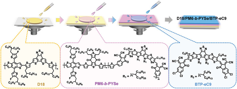 Abstract: Mechanical stretchability is a vital criterion for the wearable application of organic solar cells (OSCs), while the excessive rigidity of fused-ring small molecular acceptors make the photovoltaic film hard to meet the stretchable requirements. Herein, an effective strategy is developed to construct an intrinsically stretchable active layer by inserting copolymer PM6-b-PYSe as an interlayer between layer-by-layer processed D18 and BTP-eC9. The copolymer interlayer shunts the penetration of BTP-eC9 and facilitates an appropriate phase separation, favoring the enhanced crack onset strain of 17.69% compared to the D18/BTP-eC9 film (9.67%). Combining with the optimal energy levels, prolonged carrier lifetime, and suppressed bimolecular recombination aroused by the incorporation of PM6-b-PYSe, the D18/PM6-b-PYSe/BTP-eC9-based OSC yields an encouraging efficiency of 17.97%. In particular, the device demonstrates excellent mechanical property, which can retain over 80% after 4000 bending cycles. This work provides an effective strategy to simultaneously enhance the intrinsic mechanical stretchability and photovoltaic performance of flexible OSCs.