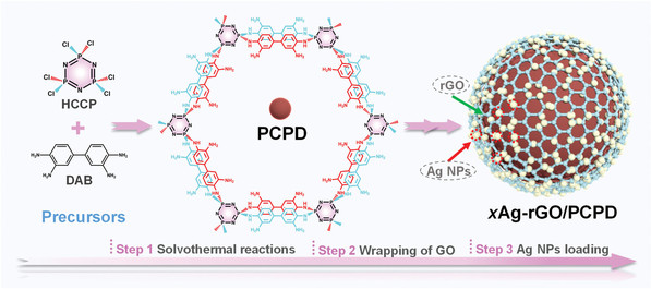 Abstract: The rational design of bifunctional photocatalysts with high adsorption and enrichment characteristics and excellent photocatalytic redox activity is an effective way to address environmental pollution and energy shortage crisis. In this study, cyclophosphazene-derived porous organic polymer (PCPD) microspheres with P─N linkage are coated with graphene oxide (GO) and loaded with Ag0 nanoparticles (NPs) to prepare covalently bonded xAg-rGO/PCPD composites. The catalyst with the highest specific surface area (denoted as 2.5Ag-rGO/PCPD) shows excellent adsorption capacity for fluoroquinolone antibiotics, removing 96.2% of ciprofloxacin (CIP) through adsorption. By applying the catalyst with the best photocatalytic redox activity (denoted as 5Ag-rGO/PCPD), 82.97% of refractory sulfonamide antibiotics are removed through adsorption-degradation, and 635.3 µmol g−1 of CO and 162.3 µmol g−1 of CH4 are generated as products of CO2 photoreduction alone. Among the co-catalytic systems, the highest CO yield of 9.16 µmol g−1 is obtained by coupling CO2 reduction with levofloxacin (LVX) degradation to harness the electron-donating power of the pollutant molecule. This study is expected to provide useful guidance for the rational design of bifunctional photocatalysts.
