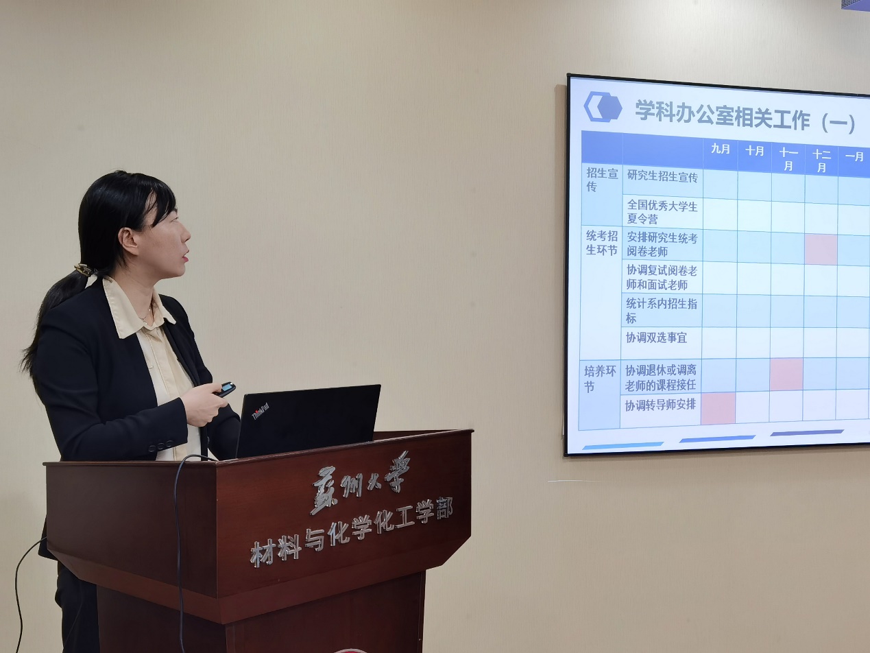 傅楠、徐小平、朱健分别对研究生培养工作、实验室安全、国有资产等条线工作内容做详细介绍。