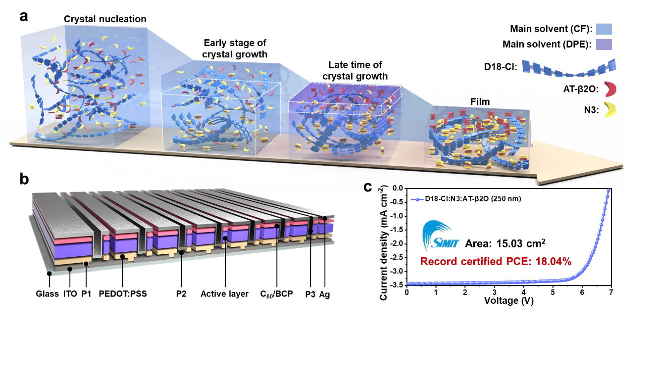 该论文解决了有机太阳能电池效率(PCE)随活性层膜厚增加急剧衰减的问题,获得纪录认证效率的小面积单节(PCE = 20.43%,0.062 cm2)和大面积模组(PCE = 18.04%,15.03 cm2)有机太阳能电池。论文以韩国a片 为第一及唯一通讯署名单位发表。第一作者为韩国a片 博士后陈海阳,通讯作者为韩国a片 李耀文教授。