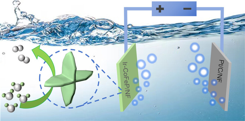 Abstract: Electrolysis of water to produce hydrogen is an efficient, clean, and environmentally friendly hydrogen production method with unlimited development prospects. However, its overall efficiency is hampered by the slow oxygen evolution reaction (OER) with complex electron transfer processes. Therefore, designing efficient and low-cost OER catalysts is the key to solving this problem. In this paper, Ir-doped Co2P/Fe2P (abbreviated as Ir-CoFeP/NF) was grown on nickel foam through the strategies of low amount noble-metal doping and mild phosphating. Phosphide derived from a floral metal–organic framework (MOF) exhibits regular three-dimensional (3D) morphology and large active area, avoiding the stacking of active sites. The addition of Ir can effectively adjust the electronic structure, change the position of the d-band center, and increase active sites, thus enhancing the catalytic activity. Hence, the optimized catalyst exhibits unexpected electrocatalytic OER activity with an ideal overpotential of 213 mV at 10 mA cm–2, as well as a low Tafel slope of 40.63 mV dec–1. Coupling with Pt/C for overall water splitting (OWS), the entire device only needs an ultralow cell voltage of 1.50 V to achieve a current density of 10 mA cm–2. Besides, the OWS can be maintained for more than 70 h. This study demonstrates the superiority of Ir-doped phosphide in accelerating water oxidation.