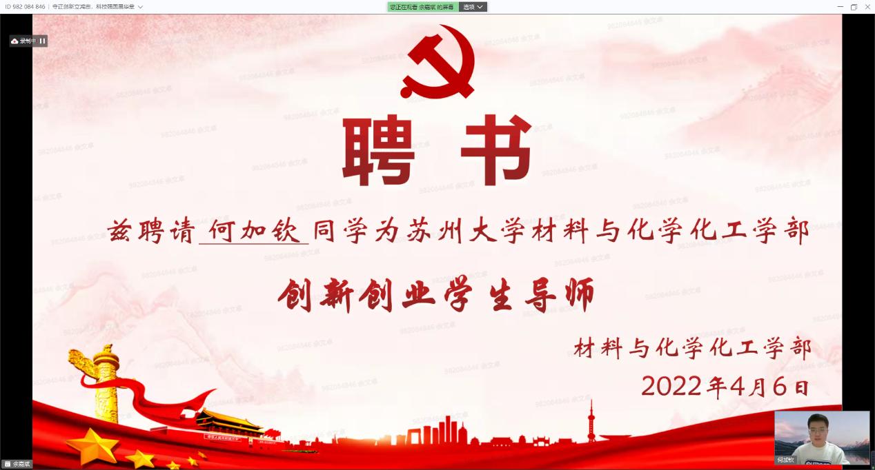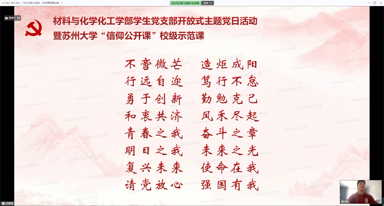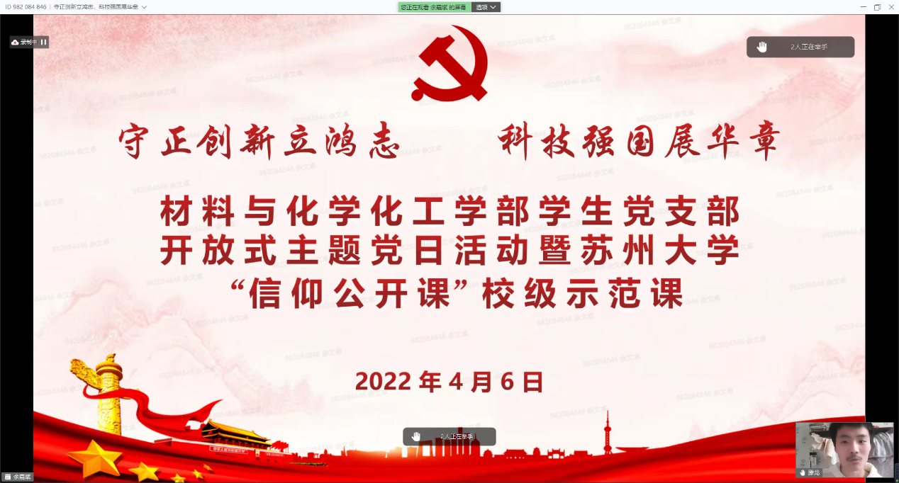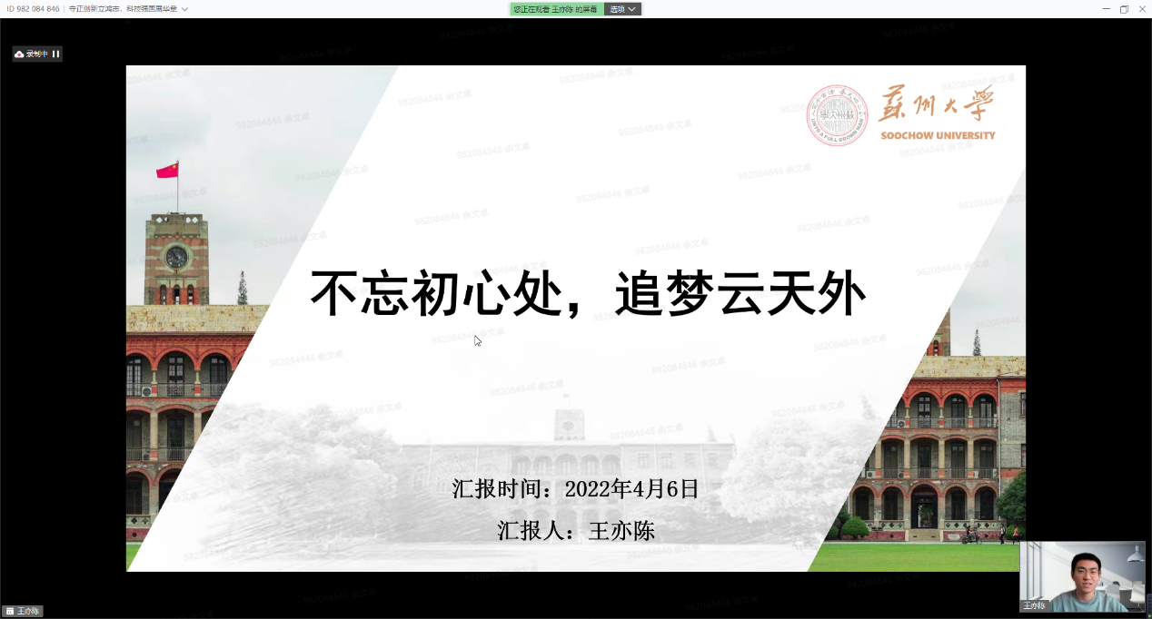党委委员、纪委委员,“挑战杯”全国大学生课外学术科技作品竞赛、“挑战杯”中国大学生创业计划竞赛、中国国际“互联网+”大学生创新创业大赛获得者代表,各学院(部)师生代表等出席本次活动。身处天南地北的苏大学子们相聚在一起,在“守正创新,科技报国”、“踔厉奋发,勇担使命”、“请党放心,强国有我”三大篇章中把握时代脉搏,从党的守正创新中汲取青春力量,赓续新时代科学家精神理想火炬,凝聚创新创业不竭动力。