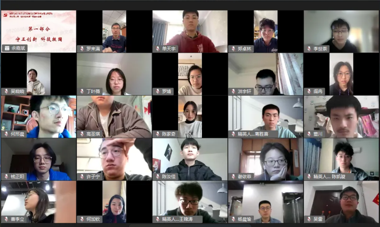 博士生党员代表何加钦、硕士生党员代表吴晓晓、本科生党员代表王亦陈围绕“不忘初心、力学笃行”“赓续前行,共向未来”“不忘初心处,追梦云天外”为主题分享了他们的科研创新探索之路。何加钦分享自己立足科研的初心,尽绵薄之力,还祖国一片蓝天。吴晓晓从“挑战杯”全国大学生课外科技学术作品竞赛简介、参赛经验分享和参赛感悟三个方面展开陈述。王亦陈为大家介绍“互联网+”大学生创新创业大赛的一些基本信息,结合自身实际,分享参赛经验。三位同学的经验分享流露出他们对学术研究的热情、对科研报国的决心,在创新创业中进一步弘扬科学家精神,肩负起新时代的科技使命。在场同学深受鼓舞,更加坚定在建设世界科技强国的伟大实践中实现人生价值的理想信念。