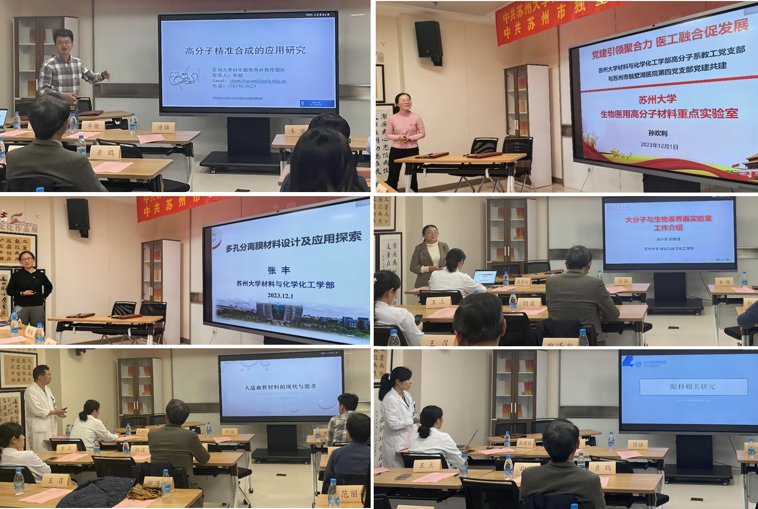 随后,两个支部的代表开展了科研交流活动。高分子系教工党支部朱健、孙欢利、张丰、刘小莉以及独墅湖医院第四党支部孙元、王立等六名党员代表分别以《高分子精准合成的应用研究》《韩国a片 生物医用高分子材料重点实验室工作介绍》《多孔分离膜材料设计及应用探索》《大分子与生物表界面实验室工作介绍》《人造血管材料的现状与需求》《眼科相关研究》为主题做了研究内容分享。与会同志们围绕报告主题,开展热烈讨论,促进双方进一步的交流与合作。
