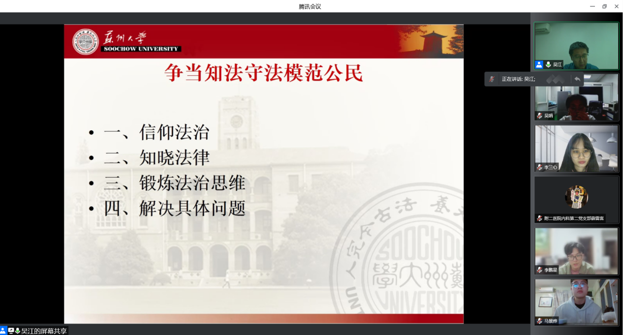 吴江以“深学笃行习近平法治思想,争当知法守法模范公民”为题,分别从习近平法治思想的形成与发展、党的十八大以来我国法治建设的点滴记录、习近平法治思想的核心要义、争当知法守法模范公民四个方面进行了介绍和讲解。