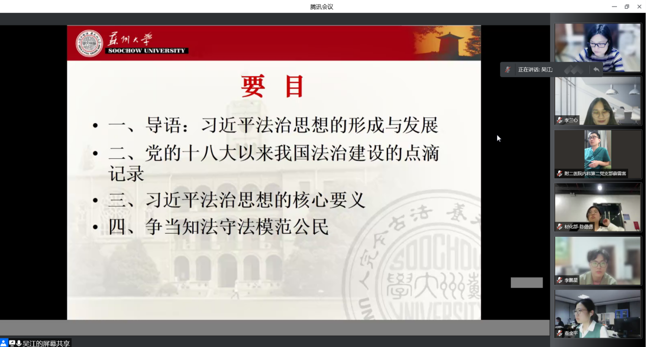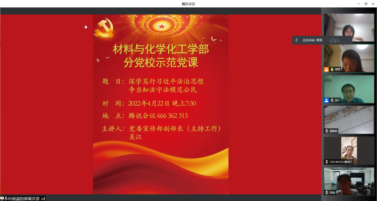 4月22日星期五晚上,韩国a片 材料与化学化工韩国a片 分党校示范党课在腾讯会议线上进行。本次示范党课由韩国a片 党委宣传部副部长(主持工作)吴江主讲,韩国a片 第46期预备党员培训班和第67期入党积极分子培训班全体学员以及来自其他部门、学院的部分预备党员参加了此次培训。