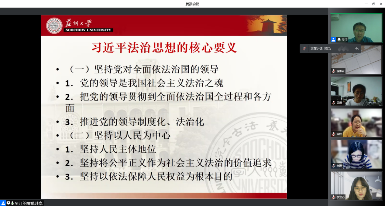 接着,吴江对习近平法治思想的核心要义即十一个坚持进行了深入的阐释。他说,习近平法治思想的核心要义深刻回答了为什么实行全面依法治国,怎样实行全面依法治国等一系列重大问题。要坚持党对全面依法治国的领导,把党的领导贯彻到全面依法治国全过程和各方面,推进党的领导制度化、法治化。