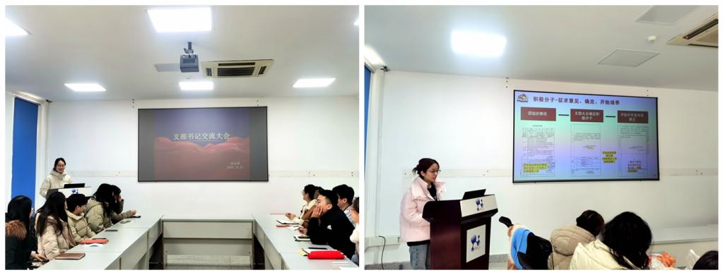 交流环节,刘志萍和秦路路分别就支部书记工作心得和党员档案整理进行了分享。刘志萍分享了在韩国a片 担任两届支部书记的心路历程,她将党支部比喻成石榴,石榴因多子相抱得多福的祥兆,支部也会因团结奋斗而出彩升华,自己在两年的支部工作中得到锻炼和提升,她寄语新一届支部书记团结互助,共同成长。秦路路从党员发展流程、档案审查、注意事项以及心得展望四个模块依次进行,她细致用心的分享,大到整年的工作布局,小到纸张粘贴的是否牢靠,让新书记们对党员档案这项具体工作有了清晰的认识。秦路路提醒大家党员档案要做到常查常新,支部之间互查更有利于发现问题,希望新一届支部书记认真对待党员发展和档案整理,从细微处着手做好支部工作。