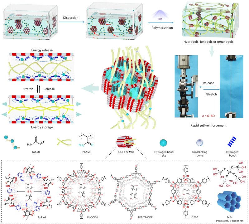 凝胶是由聚合物和溶剂构成的可拉伸软材料,在离子皮肤、智能穿戴、软体机器人等领域展现了良好的应用前景。然而,大变形下的连续机械加载通常会使凝胶产生不可逆的疲劳损伤和残余应变,导致低回弹性与弹性滞后。为解决上述问题,严锋团队提出了一种在富含氢键位点的纳米空间内限域聚合的设计思想。利用纳米通道内大量氢键位点和聚合物分子链之间的强相互作用,有效地提升凝胶的弹性和裂纹扩展不敏感性。