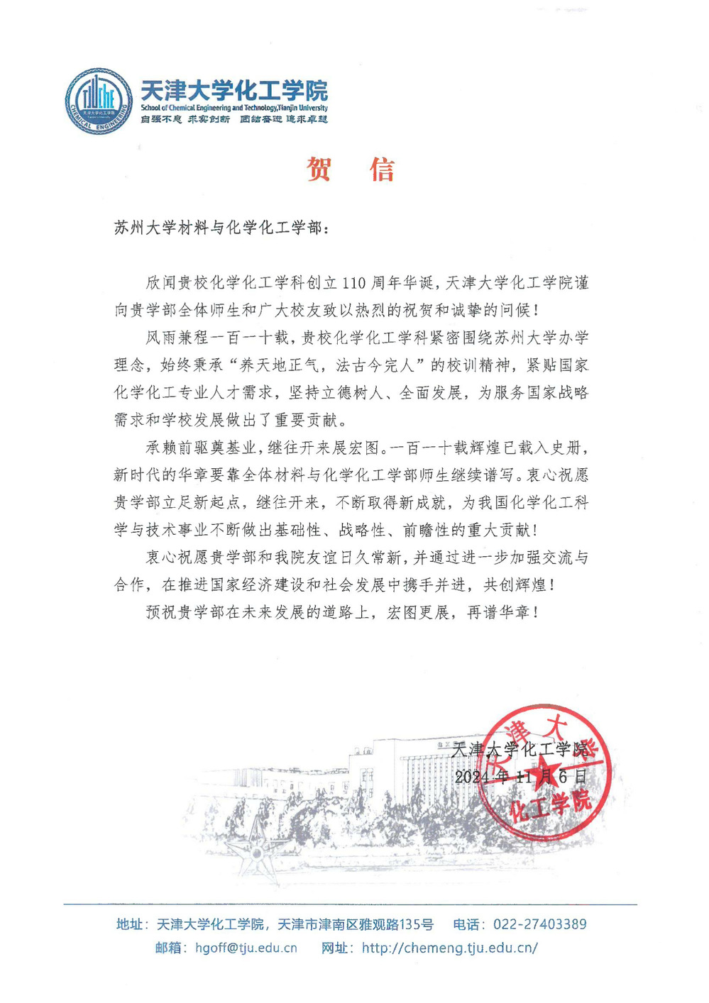 天津大学化工学院贺信