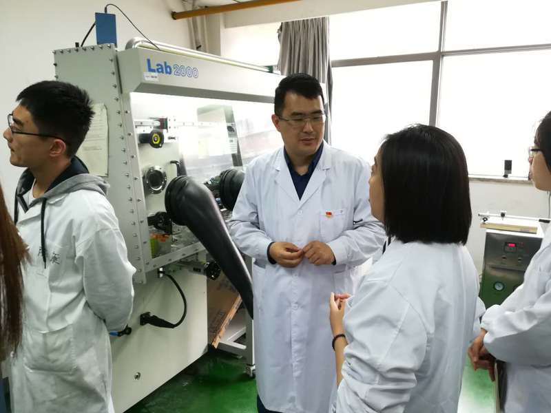 接着,张老师还带大家参加了器件制备室。通过简单的演示光伏材料,使大家了解了有机太阳能电池的工作原理、发展现状和商业化应用前景等。此外,大家对一台国产的真空镀膜机很感兴趣,张老师为大家介绍了其工作原理,是利用在高真空下加热靶材(沉积材料),使其蒸发或升华为气态粒子→气态粒子快速从蒸发源向基片表面输送→气态粒子附着在基片表面形核、长大形成固体薄膜。